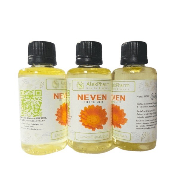 Neven biljno ulje, poznato i kao ulje nevena, dobija se iz cvetova biljke Calendula officinalis, poznate po svojim regenerativnim i umirujućim svojstvima. Ovo ulje ima široku primenu u kozmetici zahvaljujući svojim antiinflamatornim, hidratantnim i antiseptičkim svojstvima.