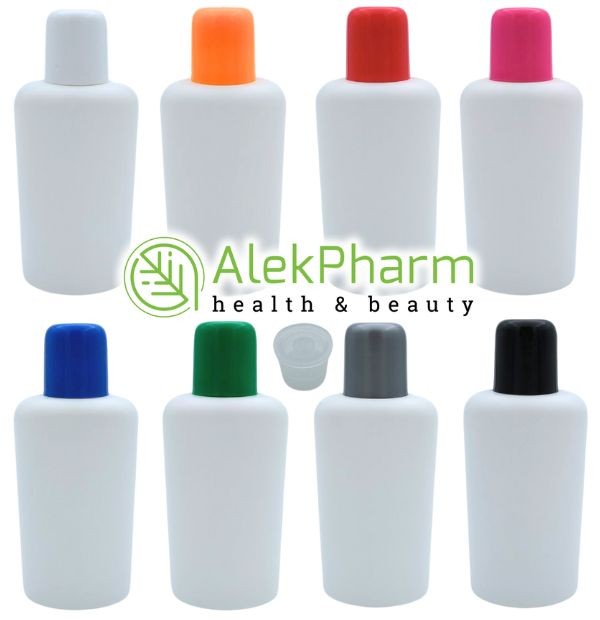 PLASTIČNA BOCA PLJOSNATA BELA 65ML SA PODČEPOM I ZATVARAČEM U BOJI