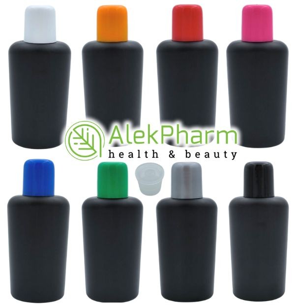PLASTIČNA BOCA PLJOSNATA CRNA 65ML SA PODČEPOM I ZATVARAČEM U BOJI